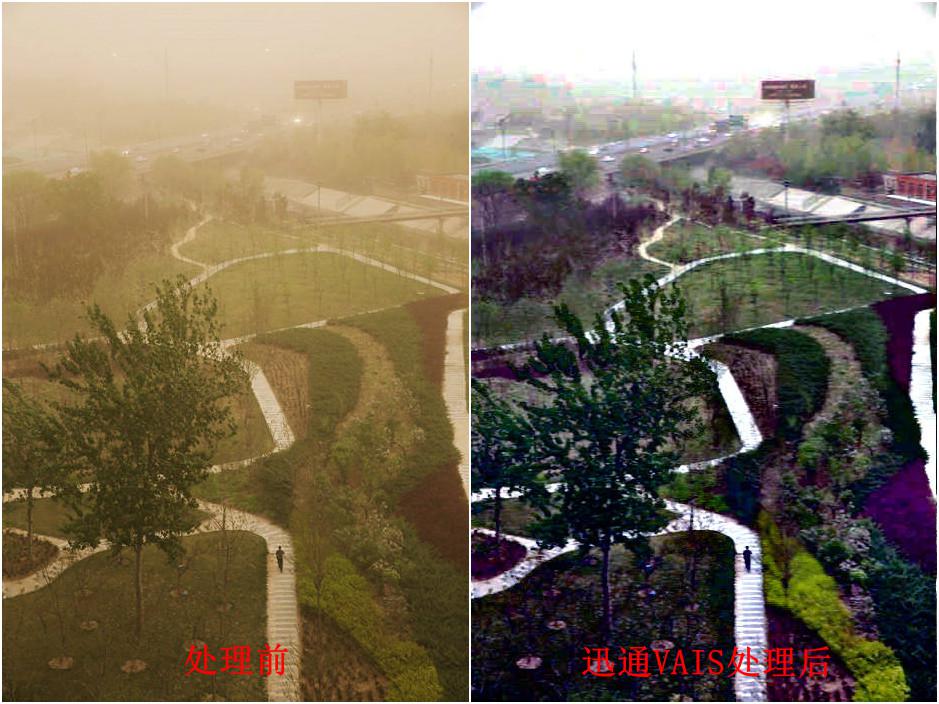 从以上五组示例图像我们可以看出,原视频图像受沙尘暴气候影响,图像品质极差,有的图像甚至被笼罩在一片黄沙中,无法看清图像内容。通过迅通VAIS软件处理后,原本被黄沙笼罩的图像得到不同程度的恢复,整体图像能见度得到提升,图像色彩得到还原,环境细节得到恢复,图像总体品质得到突破性的改善!