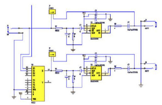 如图2所示为只有1路输入,1路输出并带有一路公共视频的电路图作为视频选择电路系统的讲解示意,J1为视频信号输入端,J5,J9为视频信号输出端.CON2为短路跳线对相应的通道进行连通与断开。当CON2断开时,相应的通道连通,视频信号从左边输入,经过匹配后从右边输出;当CON2连通 时,则视频信号输入后不能经过匹配处理而直接输出。然后利MAX4090用进行阻抗匹配进行多路视频的选择输出。该电路使用了交流耦合输出方式。从技术特征出发,将视频信号输出到媒体显示设备的最普遍方法是交流耦合,这使得接收电路可以在自己的输入端建立共模电平,该电平独立于输入视频信号的直流电平。一 个75欧的串联电阻应该尽可能近地放在靠近输出端的位置,这有助于隔离从输出端产生的下行寄生干扰,并提供最佳的信号条件。