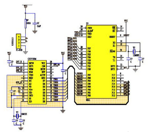 USB电路如图3所示,USB功能采用常见的CH375芯片作为USB借口控制芯片。CH375是一个USB总线的通用借口芯片,支持USB- HOST主机方式和USB-DEVICE/SLAVE设备方式。 在本地端,CH375具有8位数据总线和读、写、片选控制线以及中断输出,可以方便地挂接到单片机/DSP/MCU/MPU等控制器的系统总线上。在 USB主机方式下,CH375 还提供了串行通讯方式,通过串行输入、串行输出和中断输出与单片机/DSP/MCU/MPU等相连接。CH375有串口和并口两种与单片机的连接方式,在本系统中,CH375 芯片是通过并行方式连接到副控制芯片的,CH375的 TXD引脚通过1千欧左右的下拉电阻接地或者直接接地,从而使CH375工作于并口方式。这种并行连接方式极大的提高了数据的传输速率。
